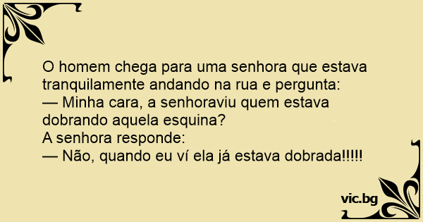 — Minha cara, a senhoraviu quem estava dobrando aquela esquina?