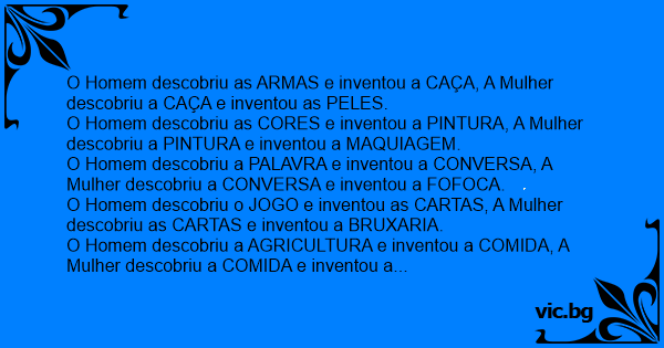 O Homem descobriu a PALAVRA e inventou a CONVERSA, A Mulher descobriu a CONVERSA e inventou a FOFOCA.