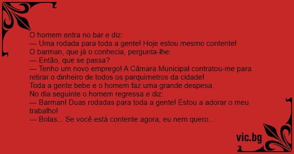 — Tenho um novo emprego! A Câmara Municipal contratou-me para retirar o dinheiro de todos os parquímetros da cidade!