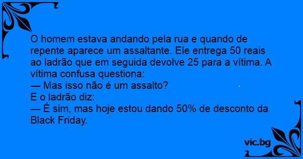 O homem estava andando pela rua e quando de repente aparece um assaltante. Ele entrega 50 reais ao ladrão que em seguida devolve 25 para a vítima. A vítima confusa questiona: