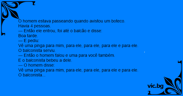 No outro dia o homem voltou e disse Vê uma pinga para ele, para ele, para ele, para ele e uma para mim, pra você não!!! Por que quando você bebe fiса nervoso.