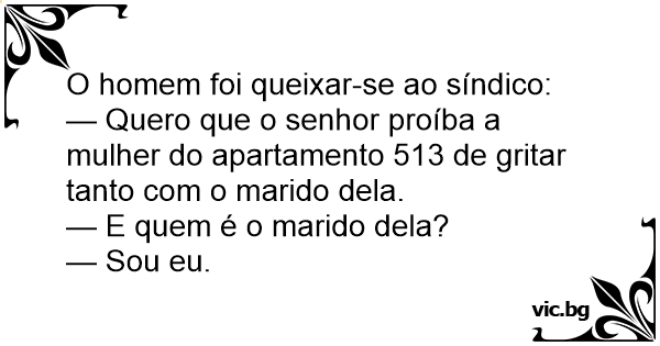 — Quero que o senhor proíba a mulher do apartamento 513 de gritar tanto com o marido dela.