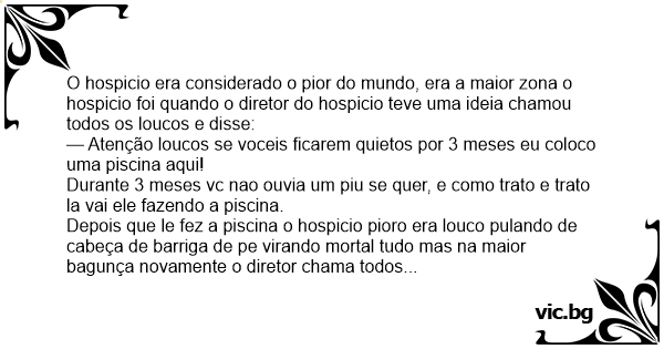 O hospicio era considerado o pior do mundo, era a maior zona o hospicio foi quando o diretor do hospicio teve uma ideia chamou todos os loucos e disse: