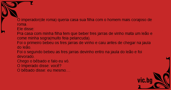 O bêbado bebeu as tres jarras de vinho entro na jaula do leão a pueira subiu o leão começo a gemer o bêbado saiu e disse cade a veia pramin da uns tapa agora.