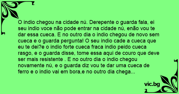 O indio chegou na cidade nú. Derepente o guarda fala, ei seu indio voce não pode entrar na cidade nú, enão vou te dar essa cueca. E no outro dia o indio chegou de novo sem cueca e o guarda pergunta! O seu indio cade a cueca que eu te dei?e o indio forte cueca fraca indio реidо cueca rasgo, e o guarda disse, tome essa aqui de couro que deve ser mais resistente . E no outro dia o indio chegou novamente nú, e o guarda diz vou te dar uma cueca de ferro e o indio vai em bora,e no outro dia chega nusinho de novo e o guarda disse aqui essa cueca de aço, e no outro dia o indio chega todo arebentado e o guarda diz o que foi e o indio responde para o guarda :indio fraco cueeeca forte indio реidо cú rasgo
