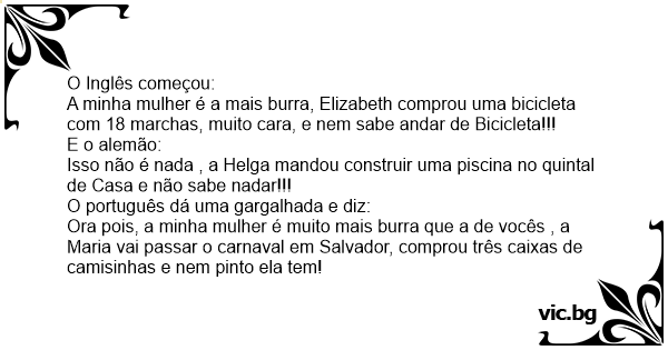 Ora pois, a minha mulher é muito mais burra que a de vocês , a Maria vai passar o carnaval em Salvador, comprou três caixas de camisinhas e nem pinto ela tem!