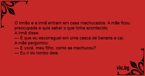 O irmão e a irmã entram em casa machucados. A mãe ficou preocupada e quis saber o que tinha acontecido.