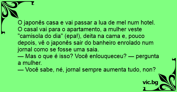 O japonês casa e vai passar a lua de mel num hotel. O casal vai para o apartamento, a mulher veste "camisola do dia" (epa!), deita na cama e, pouco depois, vê o japonês sair do banheiro enrolado num jornal como se fosse uma saia.