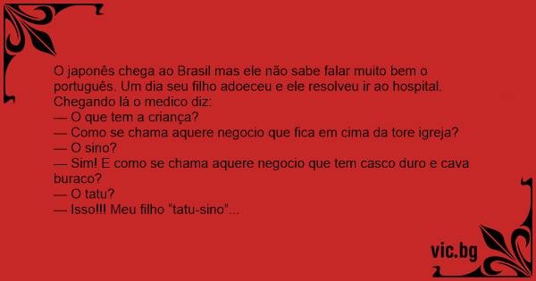 O japonês chega ao Brasil mas ele não sabe falar muito bem o português. Um dia seu filho adoeceu e ele resolveu ir ao hospital. Chegando lá o medico diz: