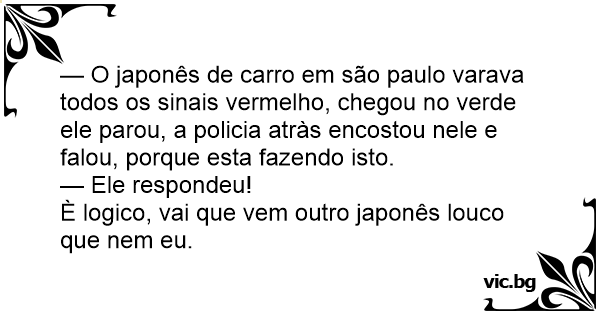 — O japonês de carro em são paulo varava todos os sinais vermelho, chegou no verde ele parou, a policia atràs encostou nele e falou, porque esta fazendo isto.