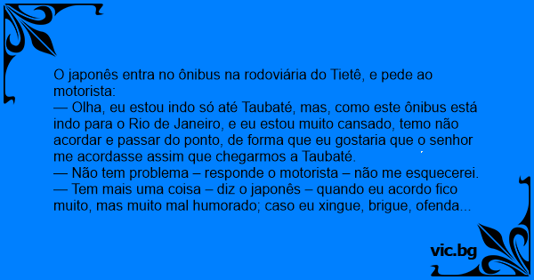 — Tem mais uma coisa – diz o japonês – quando eu acordo fico muito, mas muito mal humorado; caso eu xingue, brigue, ofenda o senhor, recusando-me a descer, não me leve a mal, pode até me jogar para fora do ônibus, contanto que seja em Taubaté.