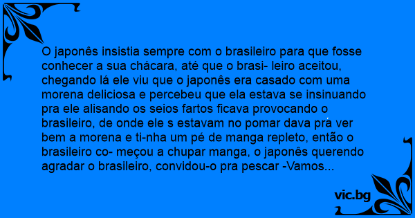 O japonês insistia sempre com o brasileiro para que fosse conhecer a sua chácara, até que o brasi- leiro aceitou, chegando lá ele viu que o japonês era casado com uma morena deliciosa e percebeu que ela estava se insinuando pra ele alisando os seios fartos ficava provocando o brasileiro, de onde ele s estavam no pomar dava pra ver bem a morena e ti-nha um pé de manga repleto, então o brasileiro co- meçou a сhuраr manga, o japonês querendo agradar o brasileiro, convidou-o pra pescar -Vamos pescar brasileiro?