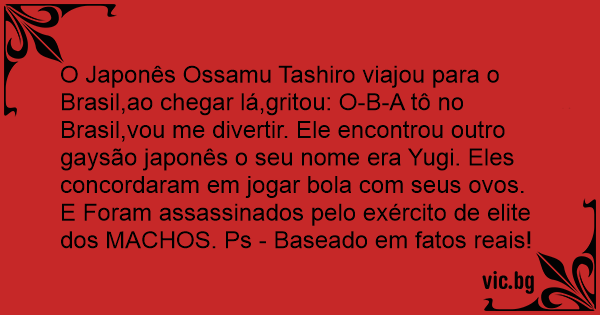 O Japonês Ossamu Tashiro viajou para o Brasil,ao chegar lá,gritou: O-B-A tô no Brasil,vou me divertir. Ele encontrou outro gaysão japonês o seu nome era Yugi. Eles concordaram em jogar bola com seus ovos. E Foram assassinados pelo exército de elite dos MACHOS. Ps - Baseado em fatos reais!