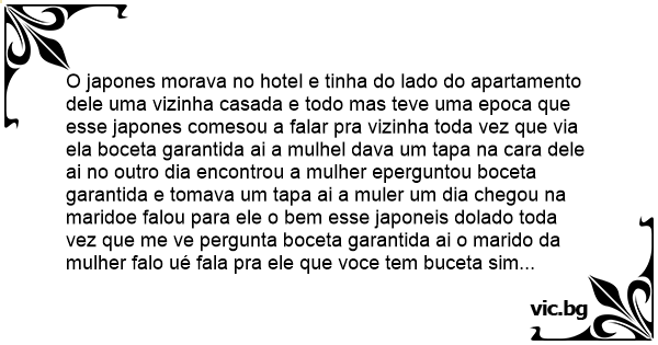 O japones morava no hotel e tinha do lado do apartamento dele uma vizinha casada e todo mas teve uma epoca que esse japones comesou a falar pra vizinha toda vez que via ela boceta garantida ai a mulhel dava um tapa na cara dele ai no outro dia encontrou a mulher eperguntou boceta garantida e tomava um tapa ai a muler um dia chegou na maridoe falou para ele o bem esse japoneis dolado toda vez que me ve pergunta boceta garantida ai o marido da mulher falo ué fala pra ele que voce tem вuсета sim ué ai o japoneis no outro dia pergunta boceta garantida ai a mulher fala tenho вuсета sim seu japoneis e um bucetao ai ojaponeis fala entao fala pr5a teu marido come boceta sua e nao de minha mulher