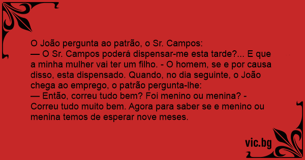 — O Sr. Campos poderá dispensar-me esta tarde?... E que a minha mulher vai ter um filho. - O homem, se e por causa disso, esta dispensado. Quando, no dia seguinte, o João chega ao emprego, o patrão pergunta-lhe: