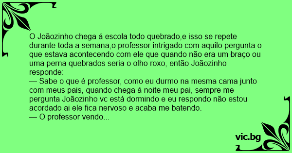 O Joãozinho chega á escola todo quebrado,e isso se repete durante toda a semana,o professor intrigado com aquilo pergunta o que estava acontecendo com ele que quando não era um braço ou uma perna quebrados seria o olho roxo, então Joãozinho responde: