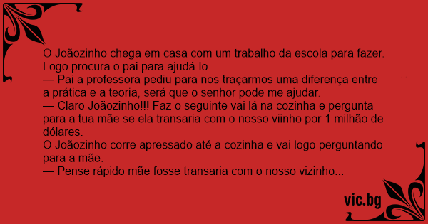 — Claro Joãozinho!!! Faz o seguinte vai lá na cozinha e pergunta para a tua mãe se ela transaria com o nosso viinho por 1 milhão de dólares.