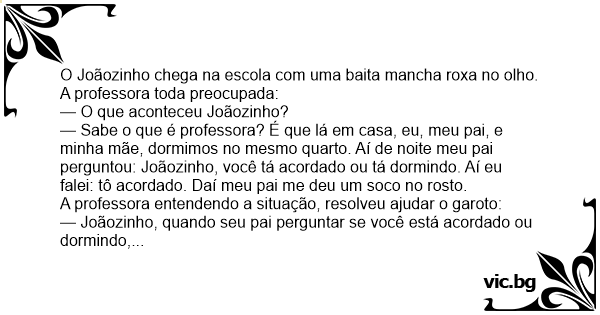 — Sabe o que é professora? É que lá em casa, eu, meu pai, e minha mãe, dormimos no mesmo quarto. Aí de noite meu pai perguntou: Joãozinho, você tá acordado ou tá dormindo. Aí eu falei: tô acordado. Daí meu pai me deu um soco no rosto.