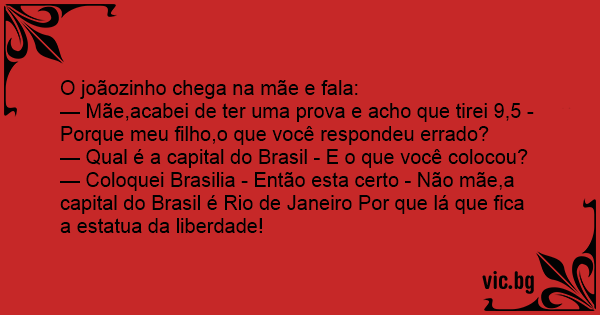 — Coloquei Brasilia - Então esta certo - Não mãe,a capital do Brasil é Rio de Janeiro Por que lá que fiса a estatua da liberdade!