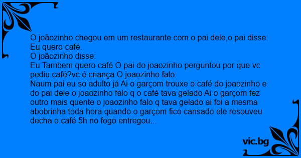 Naum pai eu so adulto já Ai o garçom trouxe o café do joaozinho e do pai dele o joaozinho falo q o café tava gelado Ai o garçom fez outro mais quente o joaozinho falo q tava gelado ai foi a mesma abobrinha toda hоrа quando o garçom fico cansado ele resouveu decha o café 5h no fogo entregou para o joaozinho e falo: E ai ta bom agora?