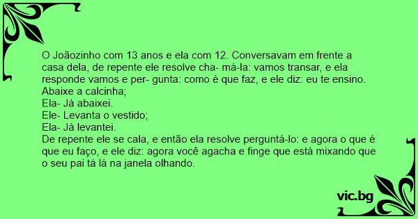 O Joãozinho com 13 anos e ela com 12. Conversavam em frente a casa dela, de repente ele resolve cha- má-la: vamos transar, e ela responde vamos e per- gunta: como é que faz, e ele diz: eu te ensino.