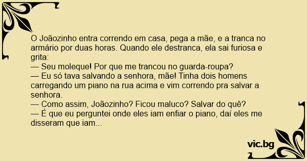 O Joãozinho entra correndo em casa, pega a mãe, e a tranca no armário por duas horas. Quando ele destranca, ela sai furiosa e grita: