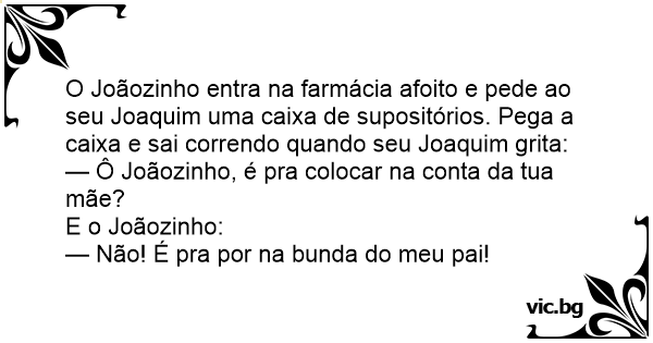 O Joãozinho entra na farmácia afoito e pede ao seu Joaquim uma caixa de supositórios. Pega a caixa e sai correndo quando seu Joaquim grita: