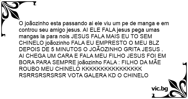O joãozinho esta passando ai ele viu um pe de manga e em controu seu amigo jesus. AI ELE FALA jesus pega umas mangas la para nois JESUS FALA MAIS EU TO SEM CHINELO joãozinho FALA EU EMPRESTO O MEU BLZ DEPOIS DE 5 MINUTOS O JOÃOZINHO GRITA JESUS . AI CHEGA UM CARA E FALA MEU FILHO JESUS FOI EM BORA PARA SEMPRE joãozinho FALA : FILHO DA MÃE ROUBO MEU CHINELO KKKKKKKKKKKKKKKK RSRRSRSRSRSR VOTA GALERA KD O CHINELO