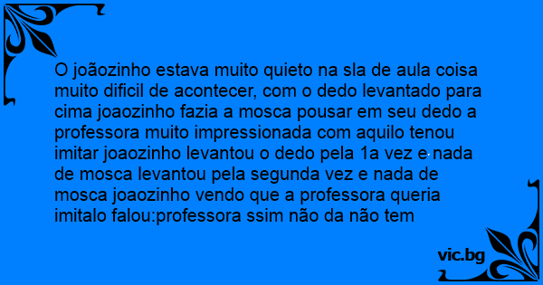 O joãozinho estava muito quieto na sla de aula coisa muito dificil de acontecer, com o dedo levantado para cima joaozinho fazia a mosca pousar em seu dedo a professora muito impressionada com aquilo tenou imitar joaozinho levantou o dedo pela 1a vez e nada de mosca levantou pela segunda vez e nada de mosca joaozinho vendo que a professora queria imitalo falou:professora ssim não da não tem