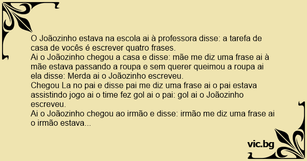 Ai chegando La no colégio a professora foi perguntar a ele as frases e ele disse: Меrdа, Gol, Batimimmm Batimimmm, ai a professora disse: Joãozinho vá pra diretoria agora ai ele disse: espera professora ainda não acabou não e disse só se for de taxi