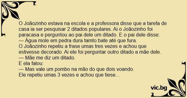 O Joãozinho estava na escola e a professora disse que a tarefa de casa ia ser pesquisar 2 ditados populares. Ai o Joãozinho foi paracasa e perguntou ao pai dele um ditado. E o pai dele disse: