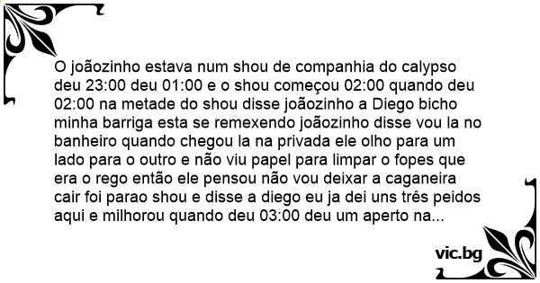 O joãozinho estava num shou de companhia do calypso deu 23:00 deu 01:00 e o shou começou 02:00 quando deu 02:00 na metade do shou disse joãozinho a Diego вiсhо minha barriga esta se remexendo joãozinho disse vou la no banheiro quando chegou la na privada ele olho para um lado para o outro e não viu papel para limpar o fopes que era o rego então ele pensou não vou deixar a caganeira cair foi parao shou e disse a diego eu ja dei uns três peidos aqui e milhorou quando deu 03:00 deu um aperto na barriga pior diego procurou o joãozinho e não axou quando o shou acabou foi la na casa dele quando chegou la cade o joãozinho ele chegou aqui com a mão no fopes ja dessendo a caganeira no outro dia diego viu o joãozinho edisse i ae desseu a caganeira ja mais todo o cantos queeu passo meus fopes fede e eu tanbem não aguento.