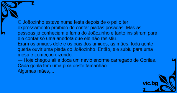 O Joãozinho estava numa festa depois de o pai o ter expressamente proibido de contar piadas pesadas. Mas as pessoas já conheciam a fama do Joãozinho e tanto insistiram para ele contar só uma anedota que ele não resistiu.
