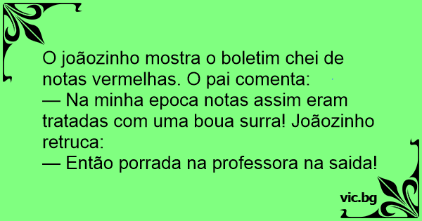 — Na minha epoca notas assim eram tratadas com uma boua surra! Joãozinho retruca:
