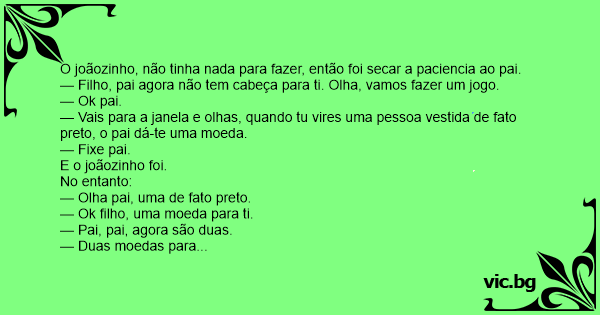 — Vais para a janela e olhas, quando tu vires uma pessoa vestida de fato preto, o pai dá-te uma moeda.