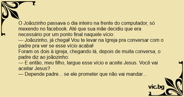 — Joãozinho, já chega! Vou te levar na Igreja pra conversar com o padre pra ver se esse vício acaba!