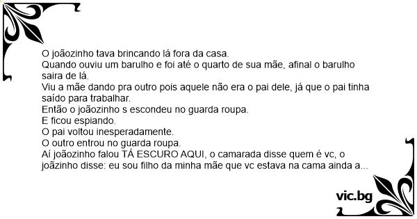 Aí joãozinho falou TÁ ESCURO AQUI, o camarada disse quem é vc, o joãzinho disse: eu sou filho da minha mãe que vc estava na cama ainda a pouco.