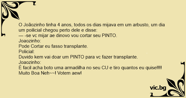 O Joãozinho tinha 4 anos, todos os dias mijava em um arbusto, um dia um poilicial chegou perto dele e disse: