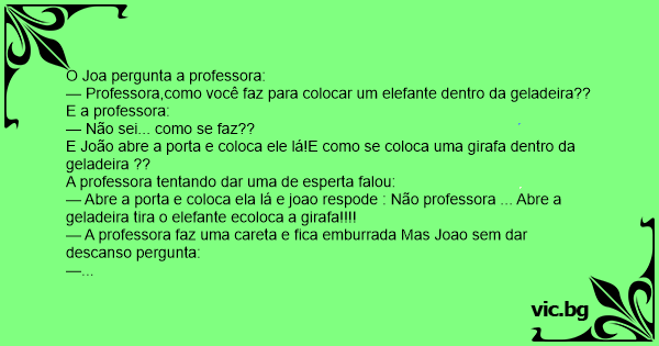 — Abre a porta e coloca ela lá e joao respode : Não professora ... Abre a geladeira tira o elefante ecoloca a girafa!!!!