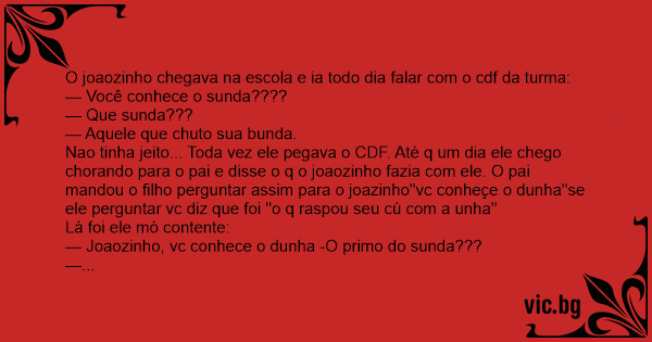 Nao tinha jeito... Toda vez ele pegava o CDF. Até q um dia ele chego chorando para o pai e disse o q o joaozinho fazia com ele. O pai mandou o filho perguntar assim para o joazinho''vc conheçe o dunha''se ele perguntar vc diz que foi ''o q raspou seu cú com a unha''