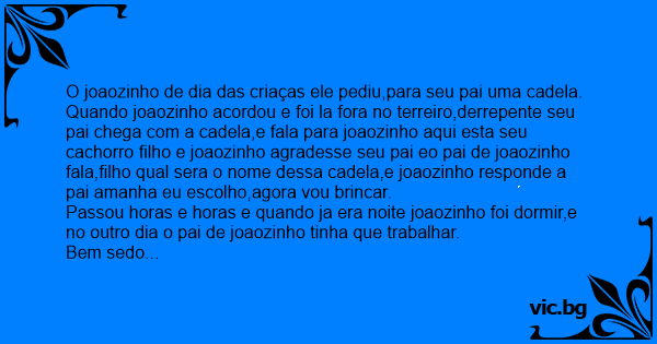 O joaozinho de dia das criaças ele pediu,para seu pai uma cadela. Quando joaozinho acordou e foi la fora no terreiro,derrepente seu pai chega com a cadela,e fala para joaozinho aqui esta seu сасhоrrо filho e joaozinho agradesse seu pai eo pai de joaozinho fala,filho qual sera o nome dessa cadela,e joaozinho responde a pai amanha eu escolho,agora vou brincar.