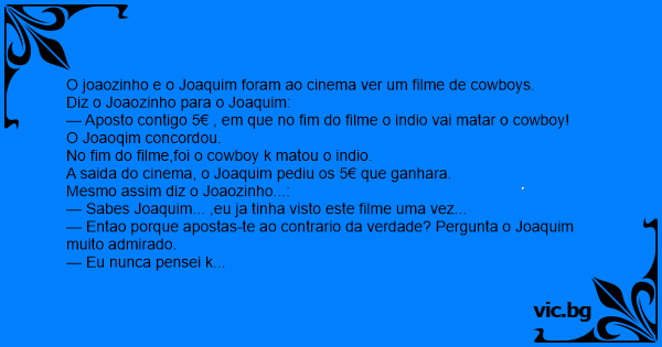 — Aposto contigo 5€ , em que no fim do filme o indio vai matar o cowboy!