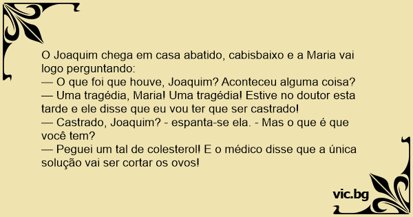 — Uma tragédia, Maria! Uma tragédia! Estive no doutor esta tarde e ele disse que eu vou ter que ser castrado!