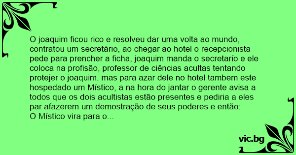 O joaquim ficou rico e resolveu dar uma volta ao mundo, contratou um secretário, ao chegar ao hotel o recepcionista pede para prencher a ficha, joaquim manda o secretario e ele coloca na profisão, professor de ciências acultas tentando protejer o joaquim. mas para azar dele no hotel tambem este hospedado um Místico, a na hоrа do jantar o gerente avisa a todos que os dois acultistas estão presentes e pediria a eles par afazerem um demostração de seus poderes e então: