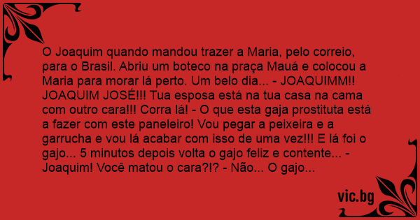 O Joaquim quando mandou trazer a Maria, pelo correio, para o Brasil. Abriu um boteco na praça Mauá e colocou a Maria para morar lá perto. Um belo dia... - JOAQUIMM!! JOAQUIM JOSÉ!!! Tua esposa está na tua casa na cama com outro cara!!! Corra lá! - O que esta gaja prostituta está a fazer com este paneleiro! Vou pegar a peixeira e a garrucha e vou lá acabar com isso de uma vez!!! E lá foi o gajo... 5 minutos depois volta o gajo feliz e contente... - Joaquim! Você matou o cara?!? - Não... O gajo se enganou... Não era outro, mas o mesmo de sempre!!!