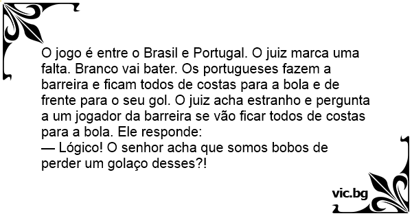 O jogo é entre o Brasil e Portugal. O juiz marca uma falta. Branco vai bater. Os portugueses fazem a barreira e ficam todos de costas para a bola e de frente para o seu gol. O juiz acha estranho e pergunta a um jogador da barreira se vão ficar todos de costas para a bola. Ele responde:
