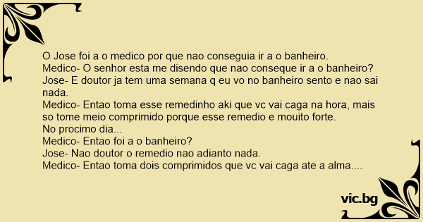 Medico- Entao toma esse remedinho aki que vc vai caga na hоrа, mais so tome meio comprimido porque esse remedio e mouito forte.
