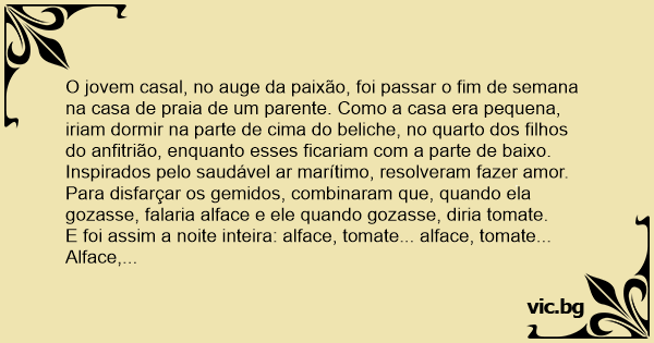 Inspirados pelo saudável ar marítimo, resolveram fazer amor. Para disfarçar os gemidos, combinaram que, quando ela gozasse, falaria alface e ele quando gozasse, diria tomate.