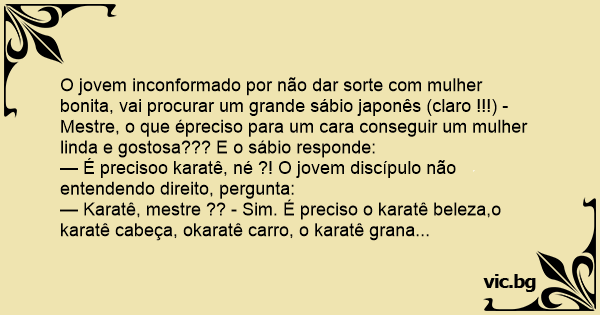 O jovem inconformado por não dar sorte com mulher bonita, vai procurar um grande sábio japonês (claro !!!) - Mestre, o que épreciso para um cara conseguir um mulher linda e gostosa??? E o sábio responde: