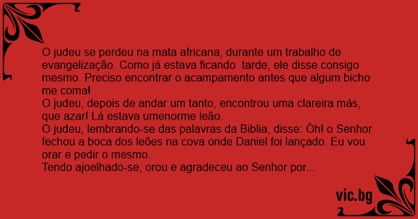 O judeu, lembrando-se das palavras da Biblia, disse: Óh! o Senhor fechou a boca dos leões na cova onde Daniel foi lançado. Eu vou orar e pedir o mesmo.